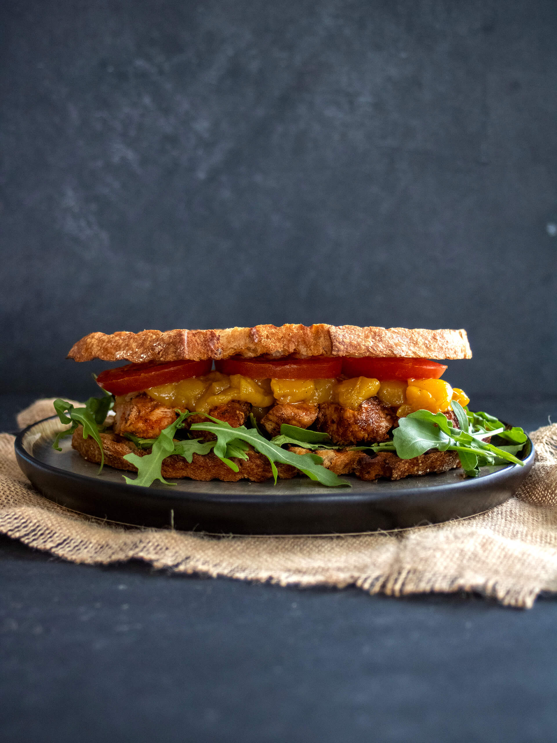 Geef je dagelijkse lunch een tropische boost met dit recept voor een gegrilde kip sandwich met mangochutney, rucola en tomaat.